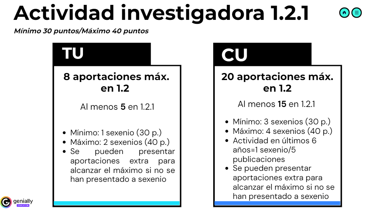 - TU: 8 aportaciones como máximo en 1.2, al menos 5 en el apartado 1.2.1 (es decir, deben ser publicaciones).