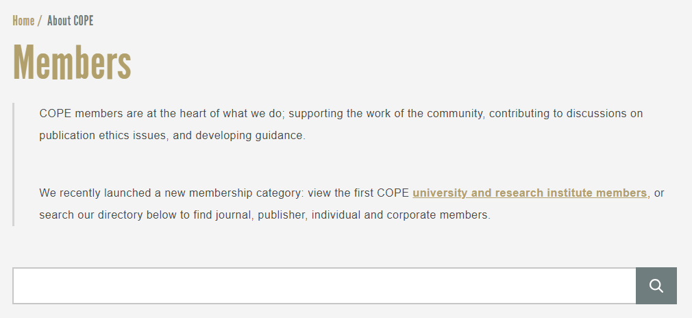 COPE (Committee on Publication Ethics) se compromete a educar y apoyar a los editores, las universidades, los institutos de investigación y todos aquellos involucrados en la ética de las publicaciones. Las Core Practices son las políticas y prácticas que los miembros necesitan para alcanzar los más altos estándares en ética de publicaciones. Cada área incluye casos con asesoramiento, orientación, educación y eventos. En COPE se recogen revistas de todas las editoriales y áreas de conocimiento.