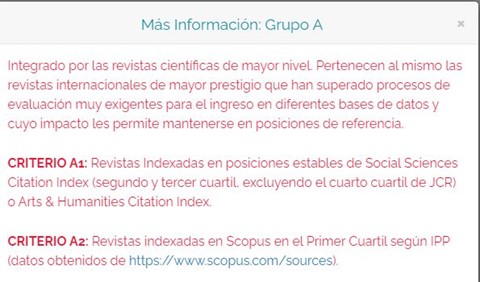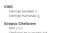 Entre otros indicadores aparece la clasificación CIRC de la revista con enlaces al grupo de clasificación de cada ámbito:
