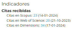 El portal ofrece conteo de citas en WoS, Scopus, Dimensions, Open Citations y Dialnet. No son citas en tiempo real, pero los números son clickables y conducen a la herramienta, donde podremos consultar las citas en tiempo real:
