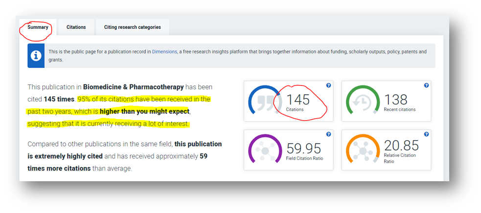Además, Dimensions nos señala si recientemente el artículo ha recibido muchas citas (esto contextualiza las citas y se menciona como indicador en algunos campos):