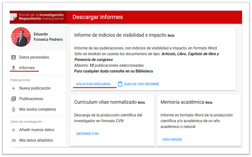 A partir de la información recogida en el portal y otra serie de indicios obtenidos de la propia Dialnet o de fuentes externas se puede obtener un Informe de indicios de visibilidad e impacto que servirá de apoyo a los investigadores para la convocatoria de sexenios, así como otro tipo de convocatorias.
