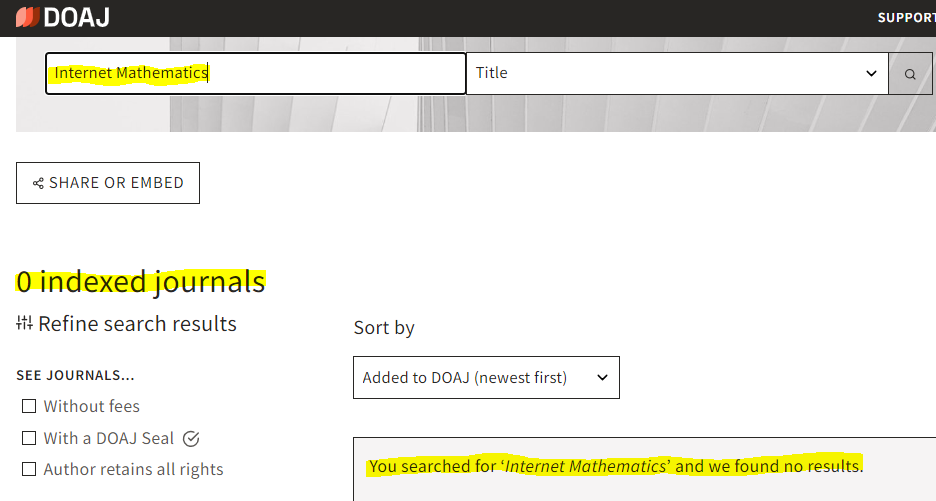 Esta es una herramienta muy útil, puesto que recopila revistas diamante que no se encuentran en otras herramientas. En el caso del ejemplo, Internet Mathematics, no podemos localizar la información en DOAJ: