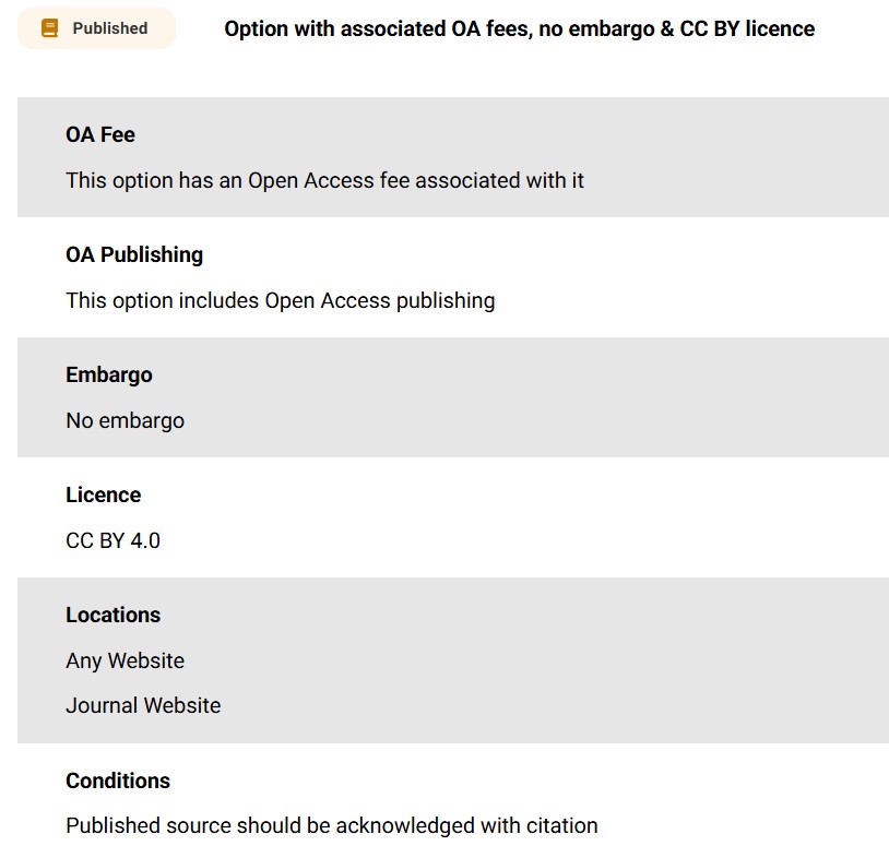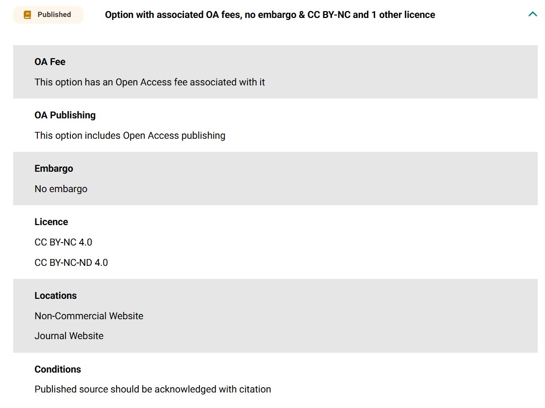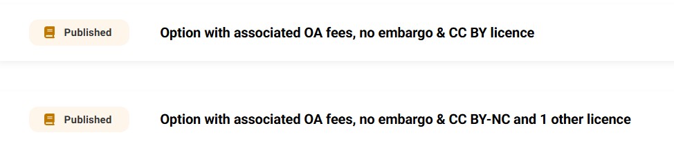 Podemos ver que es imposible depositar la versión final del editor sino existe un pago de APC. En ninguno de los dos casos existe embargo. La diferencia está en las licencias.Las revistas tienden a cobrar APCs más altas si la licencia es CC-BY, puesto los trabajos publicados bajo licencias poco restrictivas son más citados. De esta forma, según la licencia CC cambian completamente las condiciones.