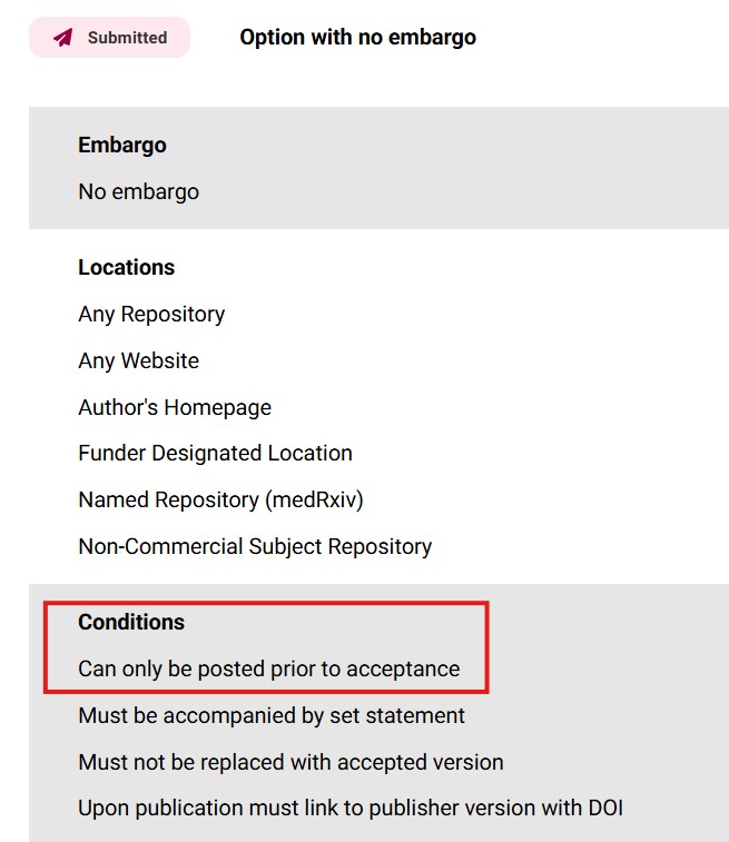 Por ejemplo, que solo se puede publicar en fecha anterior a que el paper sea aceptado. Esto es de nuestro interés, puesto que se considera mérito para sexenio que el preprint esté depositado, y algunas personas solicitantes piensan en depositar ahora el preprint para conseguir puntos en este apartado.