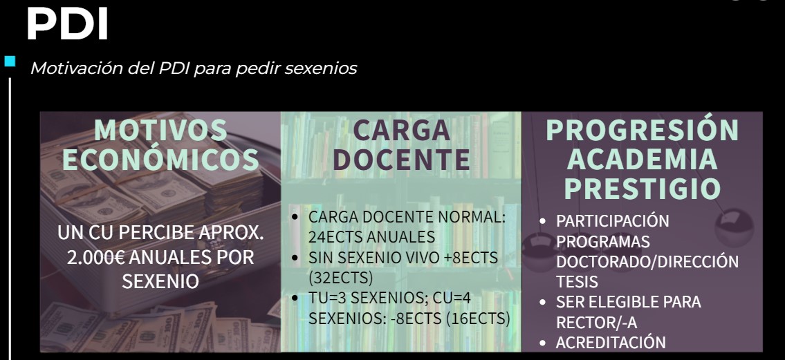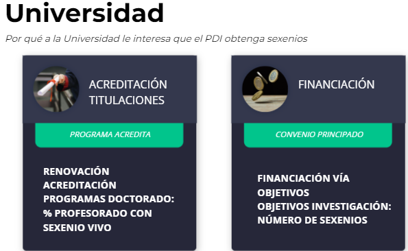Sin embargo, una atenta lectura de los distintos reglamentos, convocatorias, etc. de la Universidad aportan a los sexenios una dimensión que excede lo económico. Disponer de sexenios da acceso a cierta posición dentro de la academia, y este es un incentivo que puede revestir para el PDI la misma o más importancia que la motivación económica. Veamos algunos ejemplos.