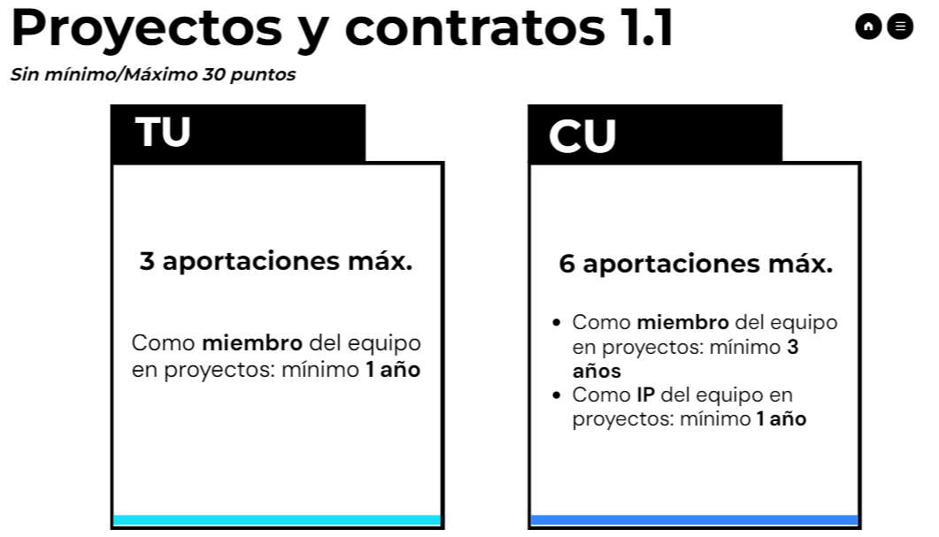 En el caso de CU podrá aportarse un máximo de 6 contribuciones. Se valorará la participación como miembro del equipo o grupo de trabajo en proyectos de investigación durante al menos 3 años o haber participado como Investigador/a Principal (IP), co-IP o miembro del equipo en un proyecto de investigación durante al menos 1 año.