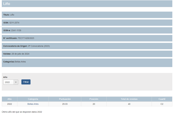 A continuación se nos muestra información de la revista, relativa a la acreditación, y en la parte inferior podemos encontrar la clasificación dentro de su categoría con la puntuación y cuartil correspondiente:
