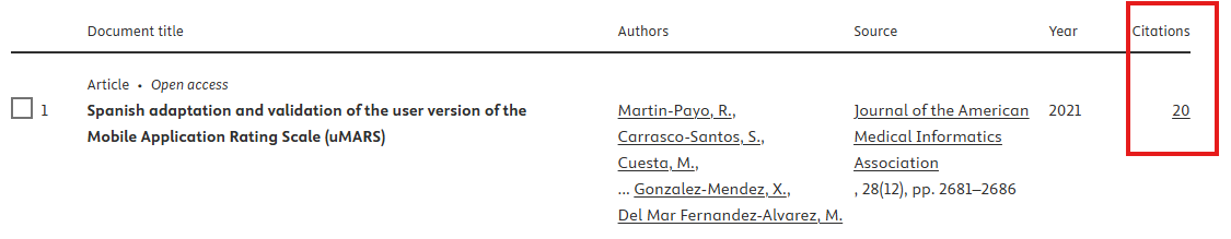 En los resultados, antes de acceder al detalle del artículo, ya vemos el número total de citas. Pulsamos en "Citation overview" para localizar las autocitas y saber las citas recibidas el año de publicación y el año en curso. CUIDADO!! Esto solo se puede hacer si has buscado por DOI o título exacto y has recuperado solo un resultado. Si has encontrado más de uno y pulsas en "citation overview" sin más, verás el estudio de citas de todos los resultados de la búsqueda. En ese caso, para recuperar solo los datos de la aportación que estás buscando selecciónala con el check situado a la izquierda del título y luego pulsa en "citation overview":
