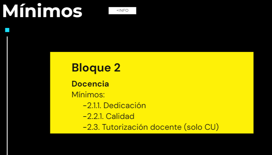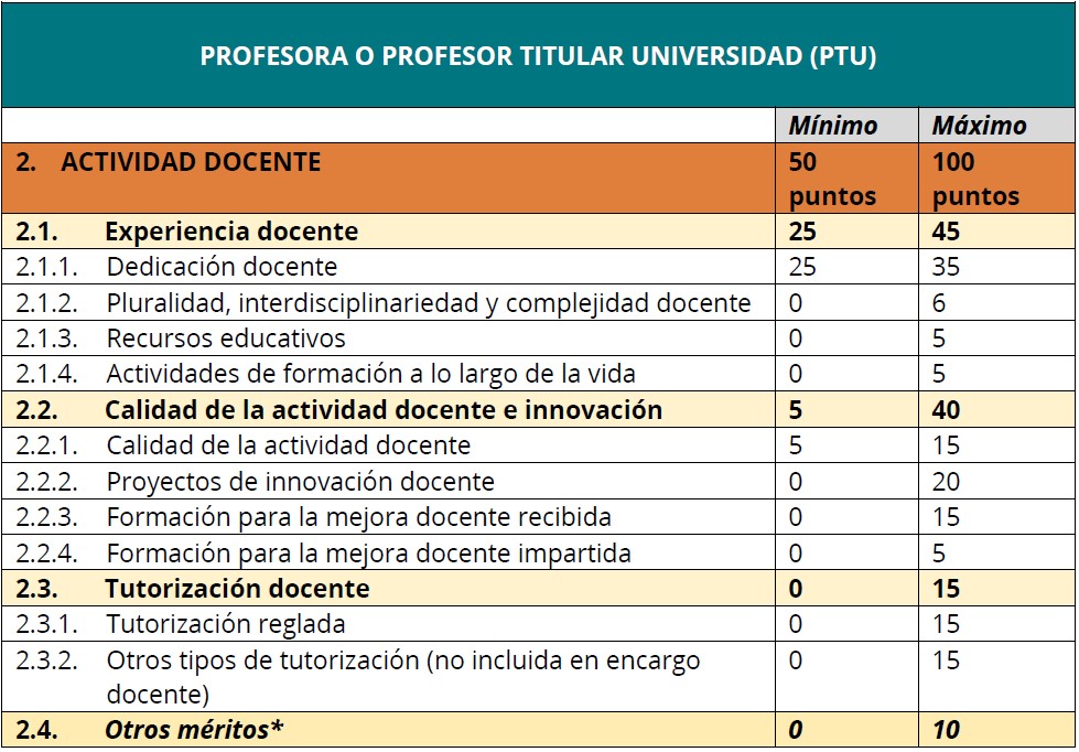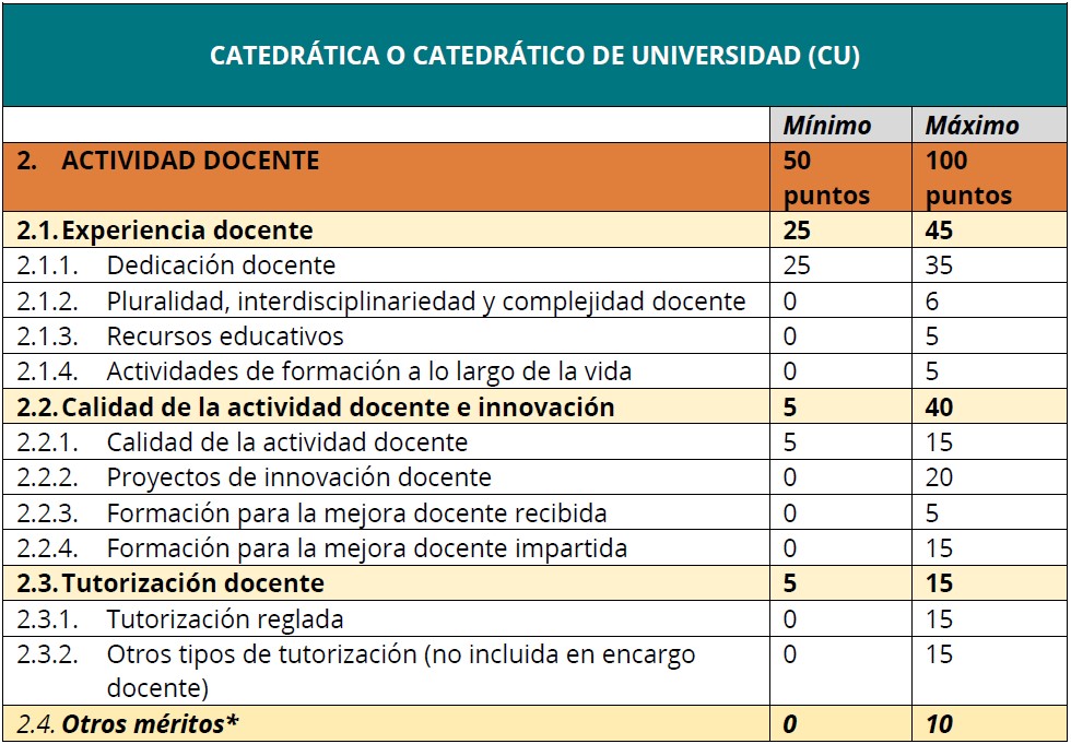 Tanto en TU como en CU la suma es 246 puntos, aunque el máximo es 100. Los mínimos son distintos, siendo dedicación y calidad de la actividad docente en TU, y añadiendo tutorización en CU.