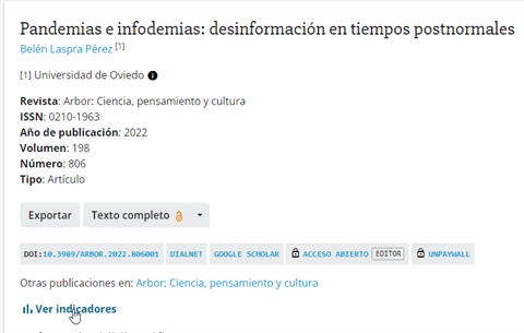 Se puede obtener la información CIRC de una publicación determinada desde el Portal de la Investigación, accediendo a las publicaciones de cualquier investigadora o investigador, haciendo click en “Ver indicadores”: