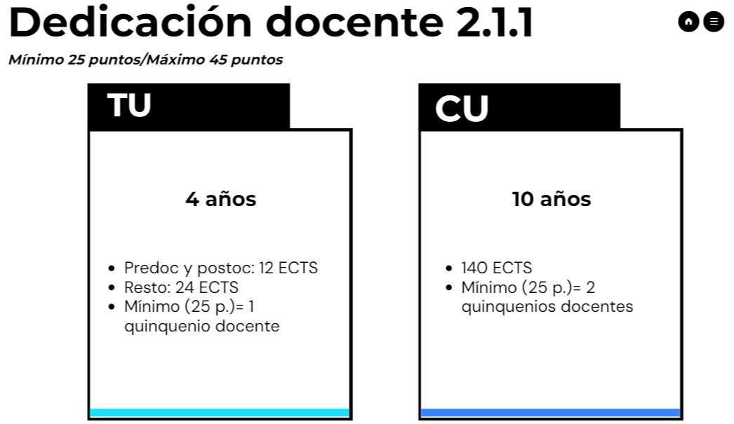 La dedicación es uno de los méritos obligatorios en el bloque de docencia (mínimo 25 puntos).