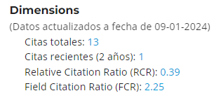 Además, Dimensions nos señala si recientemente el artículo ha recibido muchas citas (esto contextualiza las citas y se menciona como indicador en algunos campos):