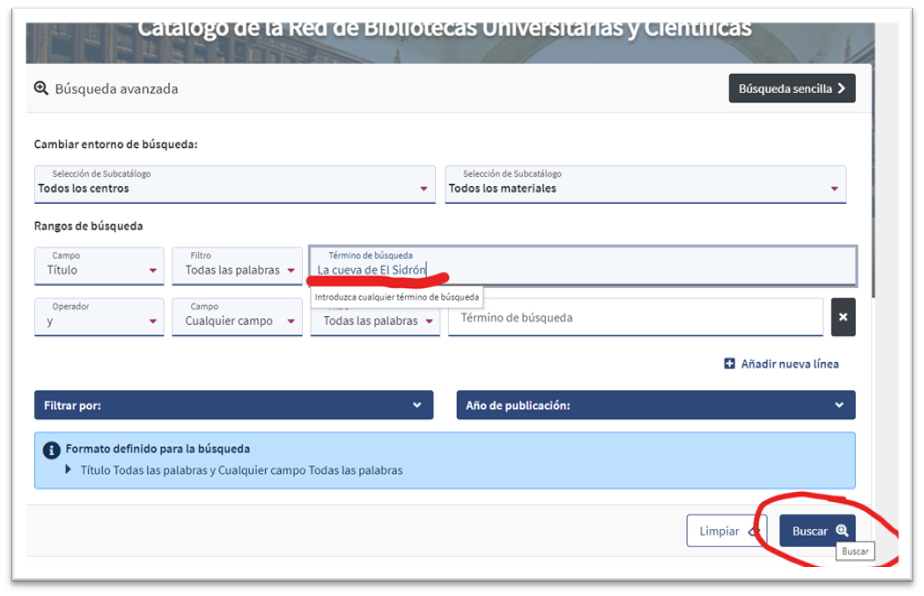 Se busca por título o cualquier otro término (autor, isbn) que identifique claramente al libro, utilizando preferentemente la búsqueda avanzada: