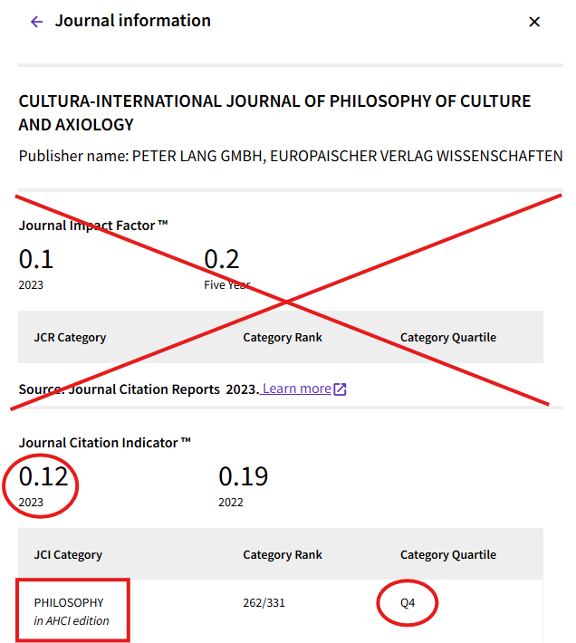En caso de que la revista no cuente con JIF Quartile, se tomarán los datos de JCI. Esto ocurre con aquellas revistas incluidas en las 25 categorías porpias de artes humanidades, estén indexadas en Arts & Humanities Citation Index o ESCI, y que además no estén también incluidas al mismo tiempo en una categoría que reciba JIF Quartile (propia de las ciencias o ciencias sociales, pudiendo estar indexada en SCIE, SSCI o Emerging).