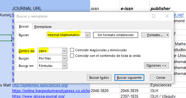 Seguimos el ejemplo de Internet Mathematics. Para saber si es diamante, abre el libro Excel. Pulsa ctrl+B para abrir la herramienta de búsqueda, introduce título/ISSN y elige buscar dentro de libro en lugar de buscar tan solo en la hoja, que es el parámetro por defecto. Pulsa buscar: