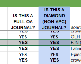 Para identificar revistas diamante podemos acudir al dataset del OA Diamond Journals Study. Desde junio de 2020 hasta febrero de 2021, un consorcio de 10 organizaciones llevó a cabo un estudio a gran escala sobre revistas diamante. Este estudio fue encargado por cOAlition S para comprender mejor el panorama de las revistas diamante.