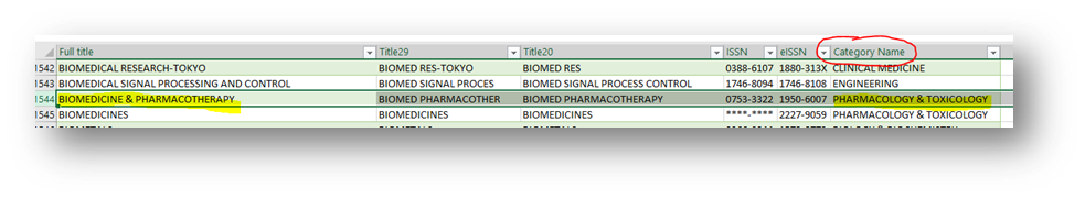 No debemos confundir los research fields de ESI con otras categorías de Clarivate. Clarivate tiene 182 categorías WoS, 254 categorías JCR y 22 research fields de ESI. Para conocer el field subject ESI buscamos la revista por título o ISSN en el Excel de revistas ESI de Clarivate (de vez en cuando debemos acudir a este enlace y confirmar que nuestro excel coincide con la última actualización, que se produce cada 2, meses, es decir, 6 veces al año) y buscamos la columna "category name":