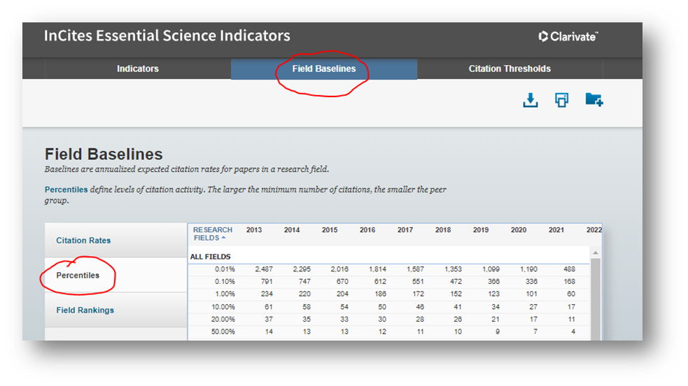 En el ejemplo nuestro "research field" es "Pharmacology & Toxicology". Con esta información vamos a ESI y escogemos "Field baselines" en el menú superior, y después "Percentiles" en el menú de la izquierda: