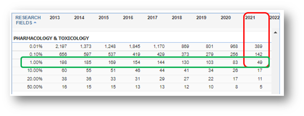 Una vez hecho esto, localizamos el "research field" de nuestra revista, Pharmacology & Toxicology, y el año de publicación del trabajo, 2021. En la columna del año encuadramos el número de citas del trabajo, 120, para localizar el percentil:
