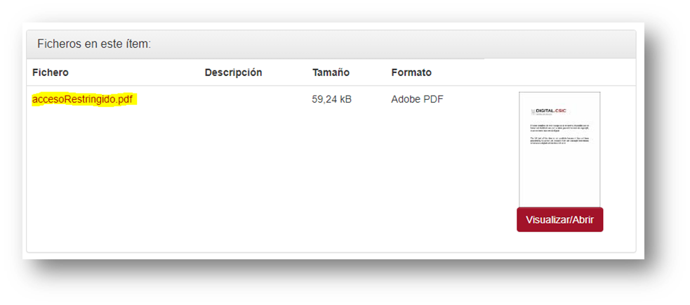 Al entrar a un registro que no es acceso abierto en el repositorio Digital CSIC, vemos esto en el fichero: