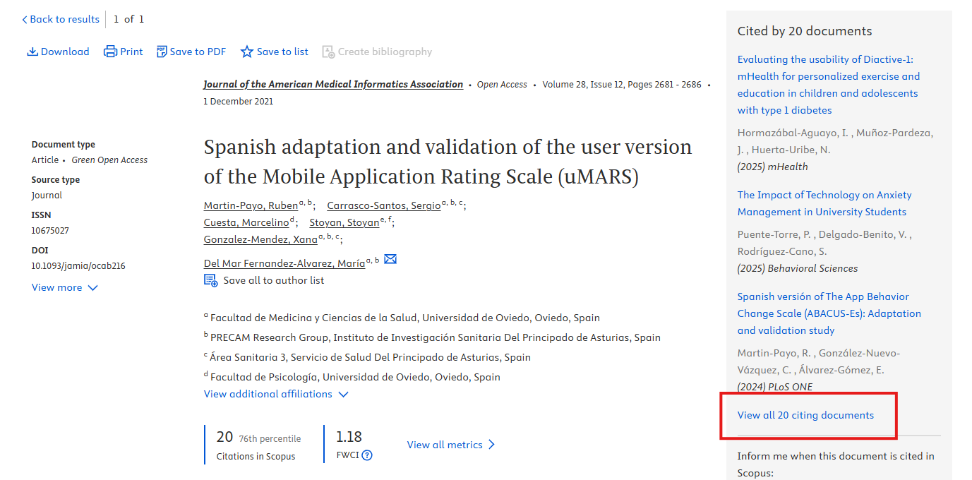 En los resultados, antes de acceder al detalle del artículo, ya vemos el número total de citas. Pulsamos en "Citation overview" para localizar las autocitas y saber las citas recibidas el año de publicación y el año en curso. CUIDADO!! Esto solo se puede hacer si has buscado por DOI o título exacto y has recuperado solo un resultado. Si has encontrado más de uno y pulsas en "citation overview" sin más, verás el estudio de citas de todos los resultados de la búsqueda. En ese caso, para recuperar solo los datos de la aportación que estás buscando selecciónala con el check situado a la izquierda del título y luego pulsa en "citation overview":