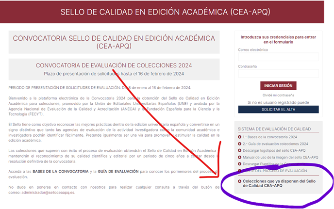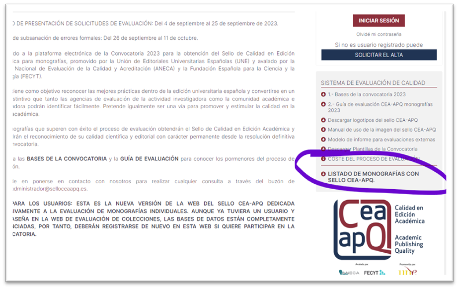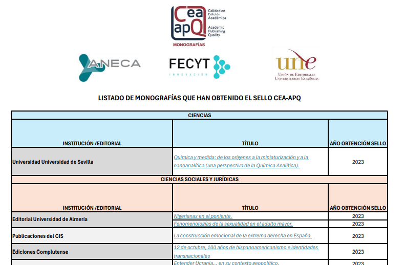 Desde 2023 se otorga también sello de Calidad a monografías. En la primera convocatoria se concedió a 35 obras. El listado se puede consultar en el siguiente enlace y pulsando sobre "Listado de monografías con Sello CEA-APQ", como en la imagen: