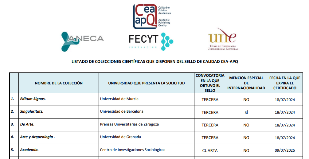 CEA-APQ es un sello de calidad pensado para colecciones de libros, que establece 14 indicadores objetivos de evaluación. Está promovido por la Unión de Editoriales Universitarias Españolas (UNE) y avalado por ANECA y FECYT.