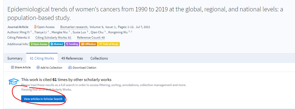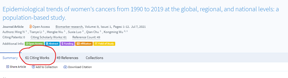 El sistema recupera el artículo. Ve a la pestaña "Citing works":