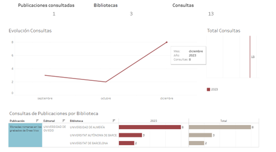Escribiremos el título o ISBN de la obra y automáticamente se nos mostrarán las estadísticas totales y detalladas por meses y años, e informándonos desde cual/cuales biblioteca/s se realizó la consulta: