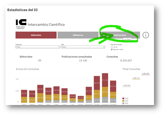 Las estadísticas de cada libro se pueden consultar desde el Portal de Intercambio Científico. Haciendo click en Publicaciones podemos consultar las estadísticas específicas de cada libro: